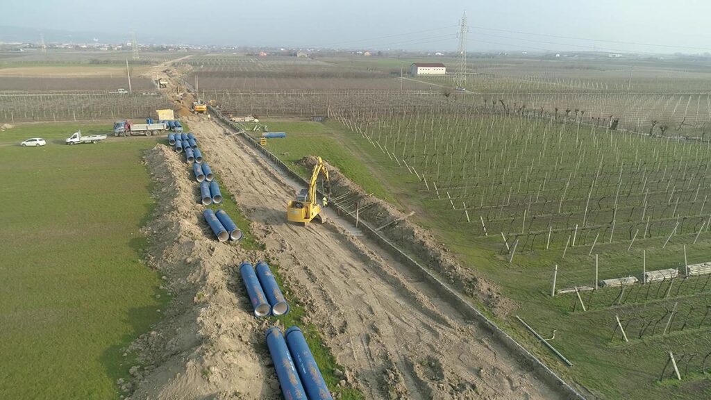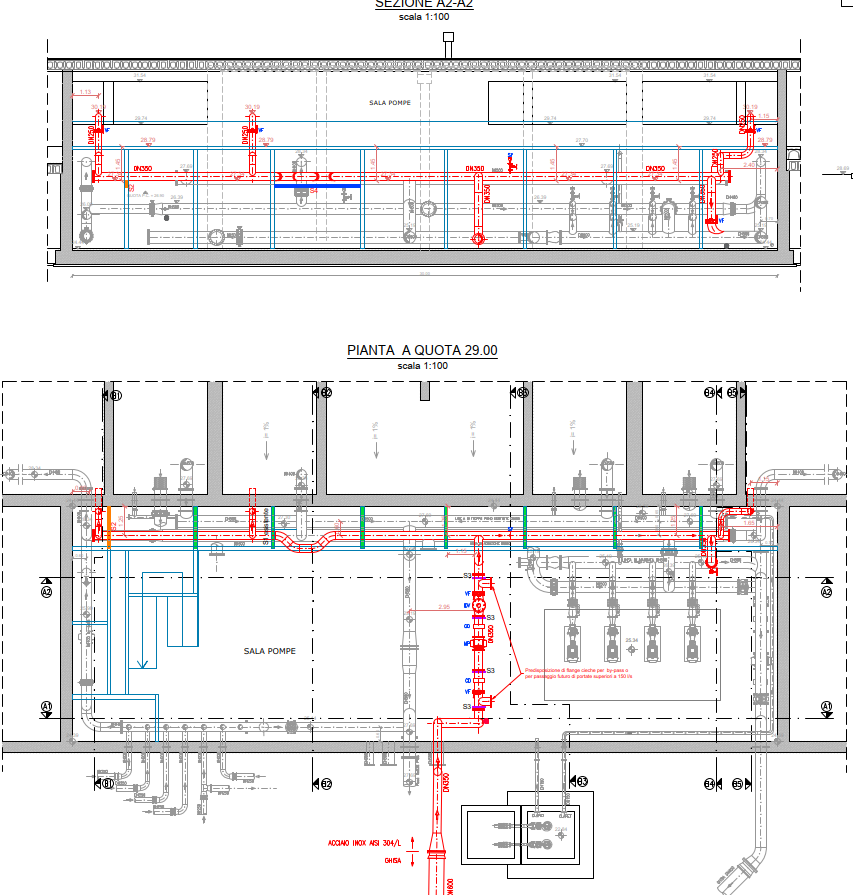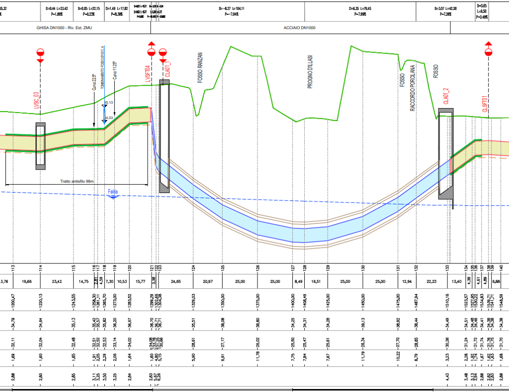 L’opera è parte del piano di interventi disposto dalla Regione veneto per far fronte all’emergenza determinata dai fenomeni di contaminazione da composti perfluoroalchilici (PFAS) delle acque sotterranee captate per uso alimentare nell’area di Almisano (Vicenza) che fornisce acqua potabile ai pubblici acquedotti di 26 Comuni a cavallo delle provincie di Vicenza, Padova e Verona. Il Lotto 1 comprende: 1) una condotta interrata DN 600 in acciao a parttire dall’area pozzi di Verona Est e si sviluppata per una lunghezza complessiva di 6120 m, affaincata da un tritubo DN50 per fibra ottica; 2) 7 attraversamenti di vaibilità e canali in microtunneling DN 1000 – DN 1600. Il Lotto 2 prevede 3) una condotta interrata DN1000 in ghisa della lunghezza di 4652 m, 4) una condotta DN 600 in acciaio di 1500 m, 5) 5 attraversamenti in microtunneling di viabilità e canali di diametro variabile DN 1000-1600. Sono stati inoltre risolte atre 32 intereferenze con scavo a cielo aperto. La progettazione è stata redatta interamente in forma digitale (BIM)